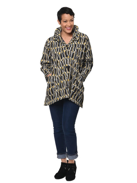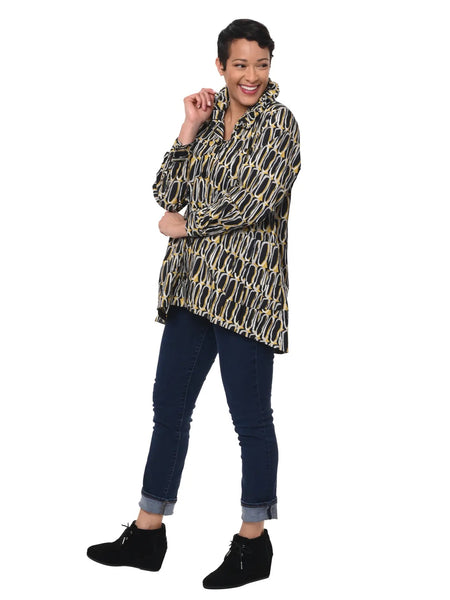 Long-sleeved, roomy, button down blouse/jacket in crisp cotton with tube collar, front seam detail, front patch pockets and buttoned cuffs.