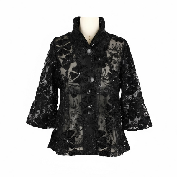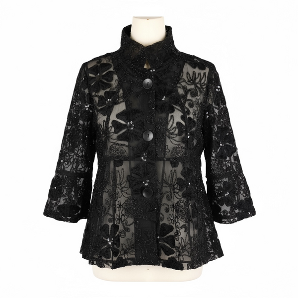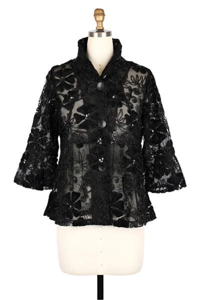 Flower designed with chenille, shiny eyelash ribbon, and sequins on mesh