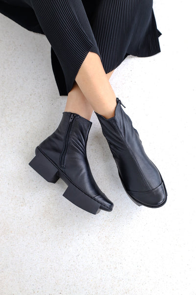 This sleek boot features a minimalist design set on Trippen’s signature box sole, complemented by an inside zipper for ease. It boasts a double platform base crafted from luxuriously soft leather for exceptional comfort and style.