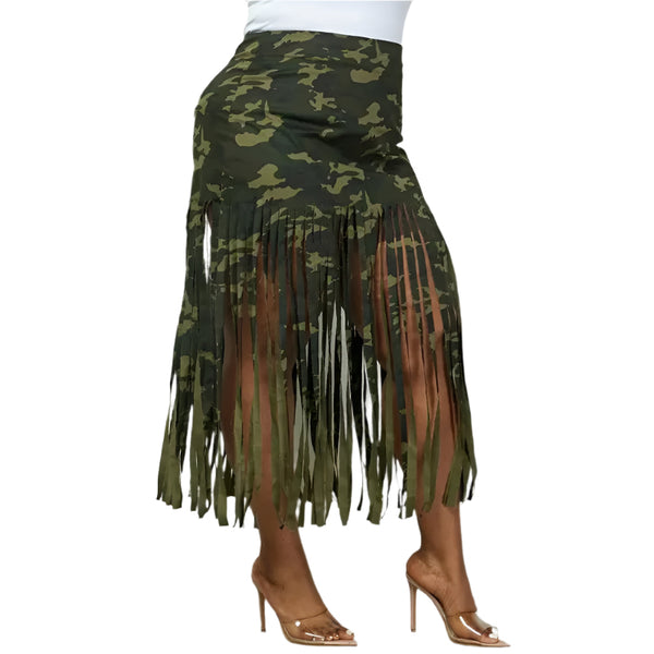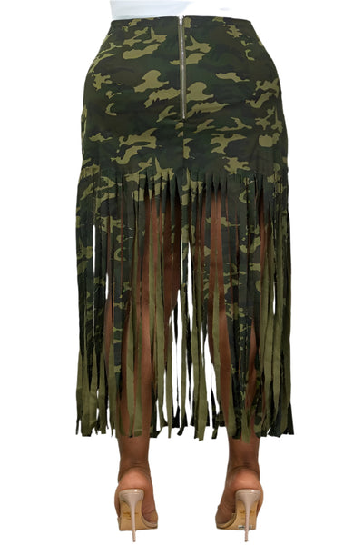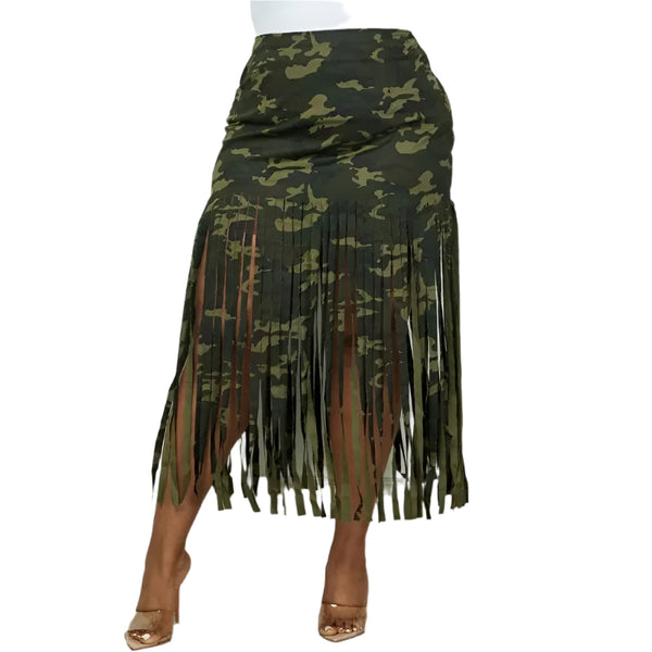 Camo Fringe Hem Midi Skirt, * Long Fringe Detail, * Midi Skirt, * Regular Size Length: Long Sleeve Style: Military Fabric: Denim