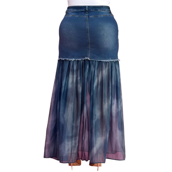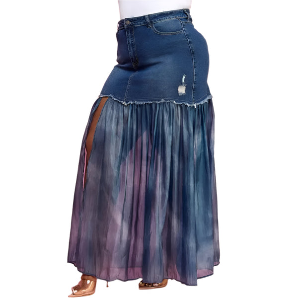 Front Slit Mesh Pleated Patchwork Maxi Denim Skirt, * Front Slit , * Mesh Pleated Patchwork, * Maxi, * Denim Skirt, * Plus Size Pattern: Plaid Length: Style: Ruffle