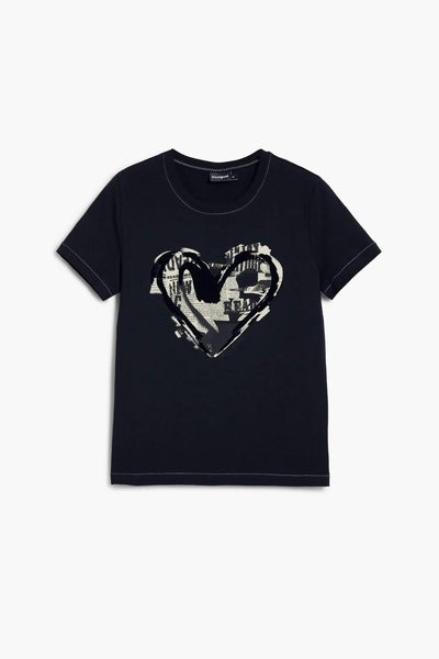 Short-sleeve t-shirt with a round neck, print, and 3D details of embroidered cord featuring a logo and a female face.