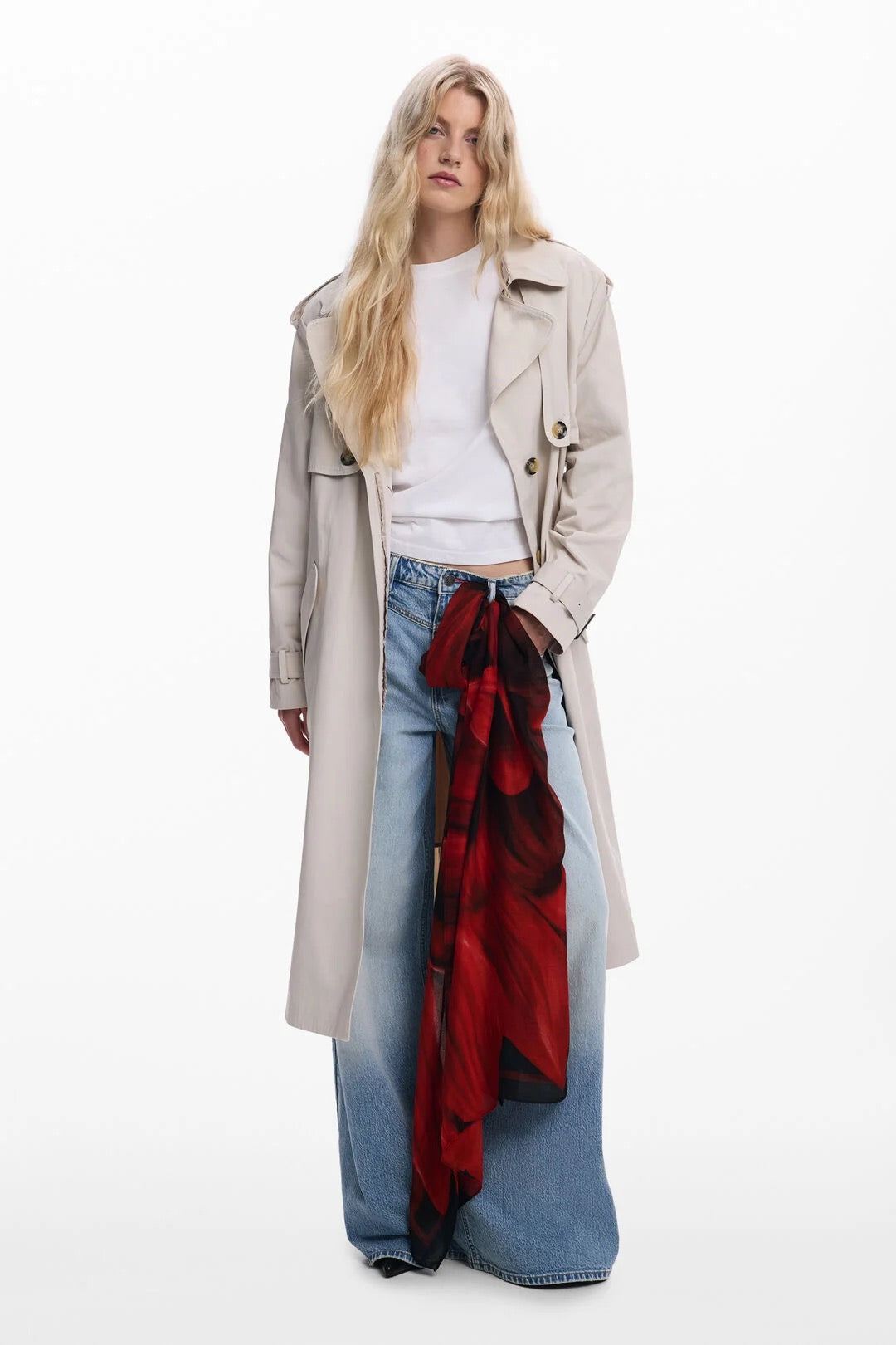 Large rectangular scarf with a large flower print in red tones on a black background.