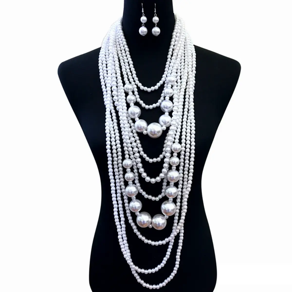 Silver and Chunky White Pearl Long Multi Strand Layered Necklace Set.
