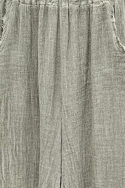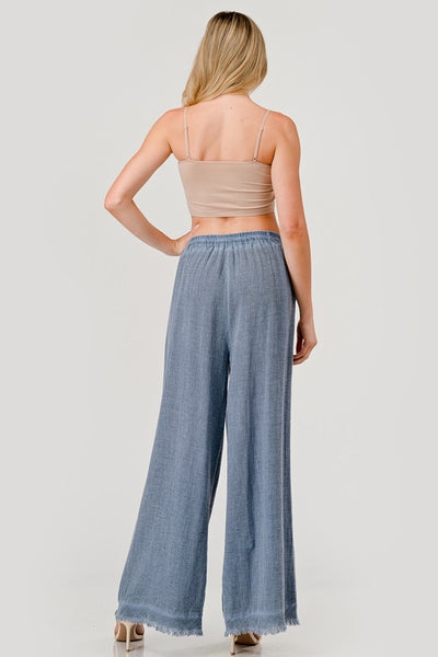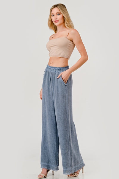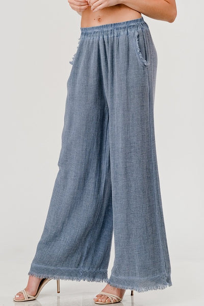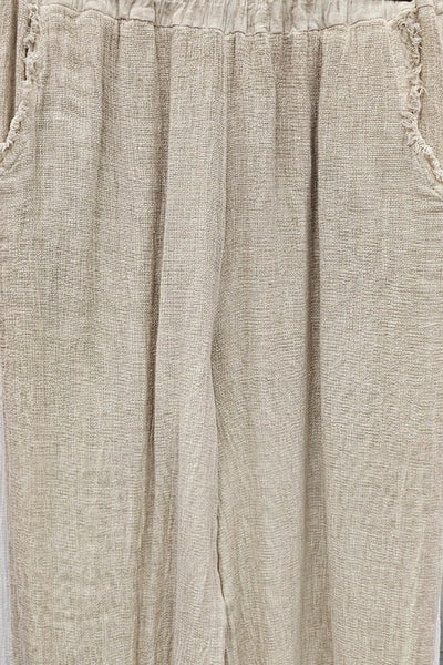 Palazzo style trousers, in linen and cotton, with fringes on the pockets and on the hem, loose fit.