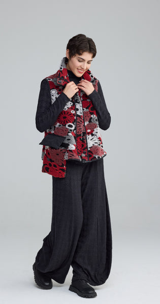Funnel neck, front snaps, sleeveless, one hanging zip pocket with flap and one patch pocket join the floral boucle for a colorful item.