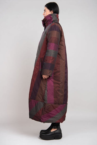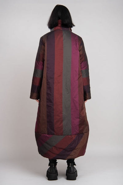 This remarkable piece has drama, vivid hues and falls to the ankles... just what every fashionista wants. This is a tulip shaped jacket with wide stripes in rich scarlet, wine, pink, bronze and grey. Angled wide welt front pockets, hidden snap front closure and offset striping on the hem finish it. See you at the Citadel! Fit is true.