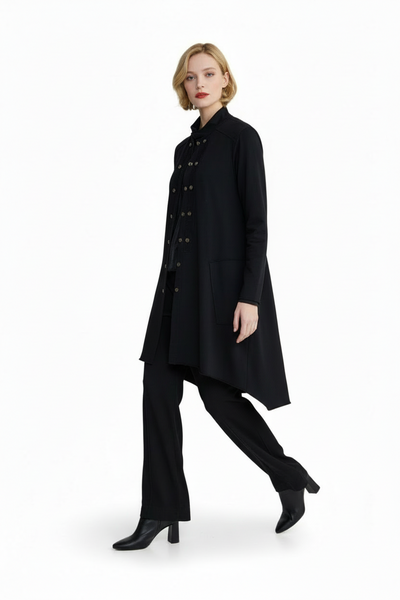 Button down, funnel neck, front pockets with side opening, asymmetry at the hem join the mixed-media fabric for a fun Autumn coat.