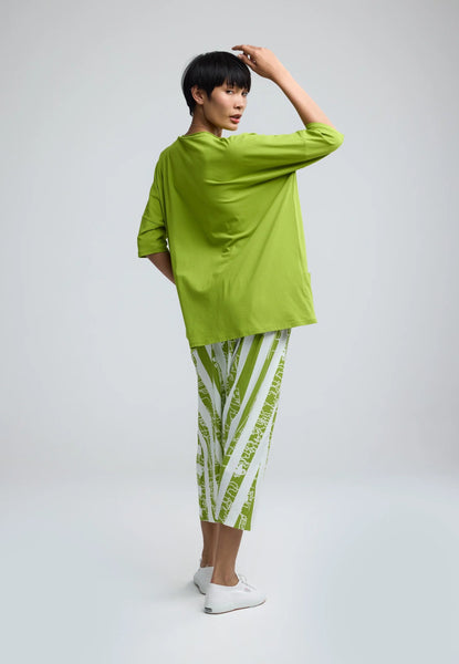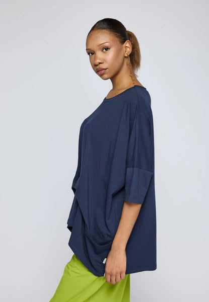 ✓ Architectural T-shape silhouette featuring a relaxed, straight cut and elbow-length sleeves for modern coverage.