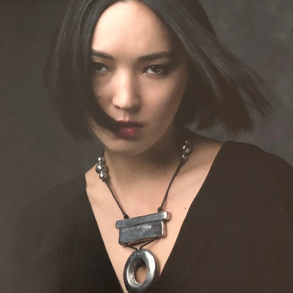 Craftsmanship is the main element of our collections. Each bijoux preserves creativity, experimentation and technique. We care for what surrounds us we are committed to the reuse of aluminum, and in the attention for the chosen materials, respecting each other and nature. Each piece is individually created by hand, this makes it unique in its being, for this reason jewels can have small differences between one piece to another piece, this shouldn’t be considered defect but rather part of the glamor. All jewels come individually wrapped in plastic bags. • Handmade • Imported • Italian design • Recycled aluminum • Nickel Free • Stainless • Hypoallergenic • Adjustable waxed cotton cord SIZE • Length 19.68" • Width First bar 2.75" Circle 1.96" • Height from Bar & Circle 3.14" • Length cm. 54,5