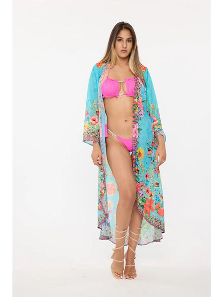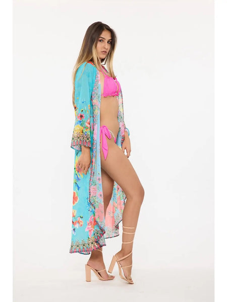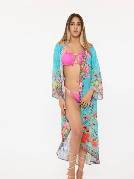 Sheer light weight duster. Embellished crustal highlights. beautiful color, easy to style. Effortless duster, easy to wear on a dress, jeans , shorts or swimwear