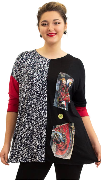 - Tunic contains a breezy, black, jersey, rayon knit and polyester blend patterned knits.