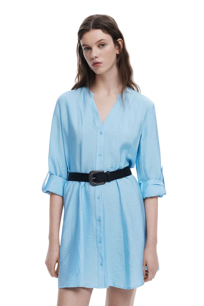 Short shirt-style dress, with long sleeves, V-neckline, button closure, and adjustable belt