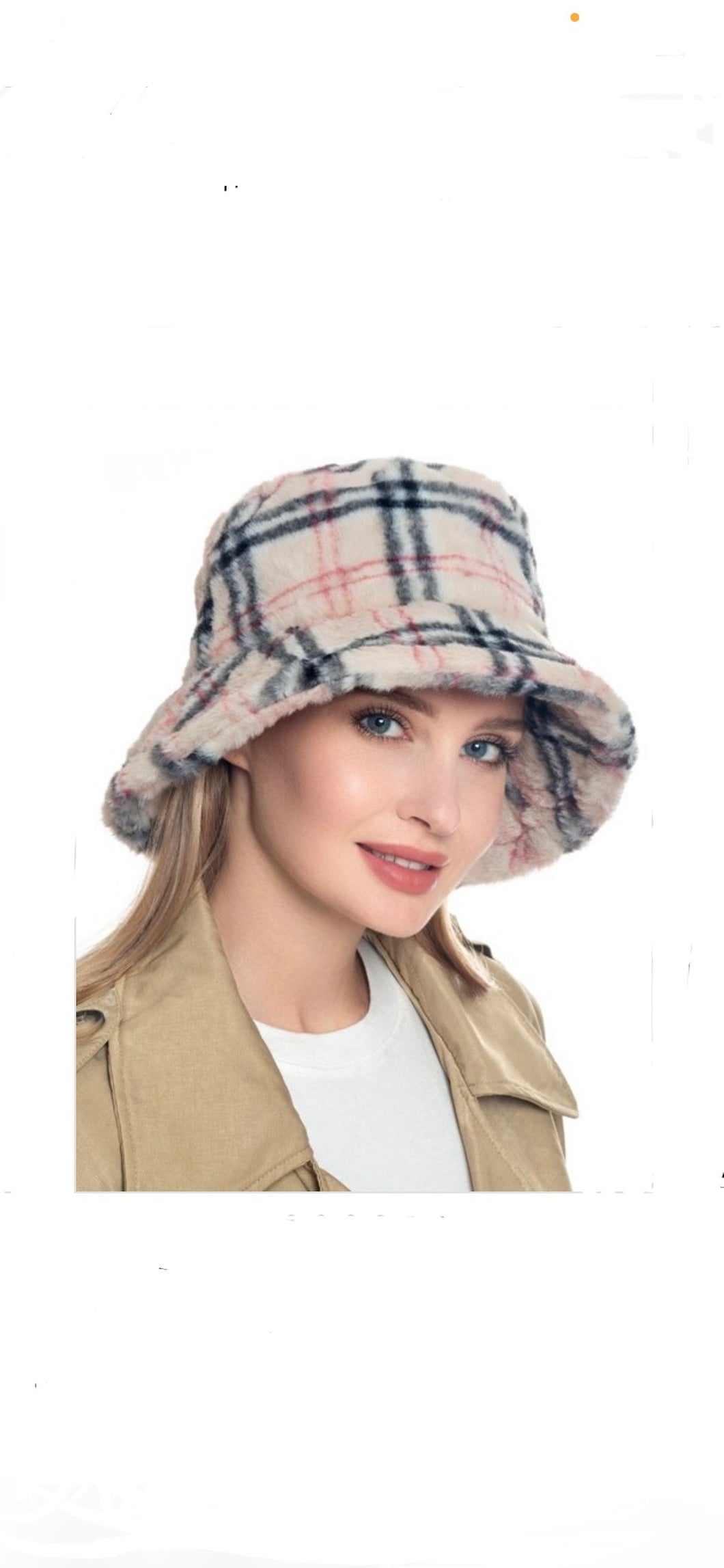 Plaid Patterned Faux Fur Bucket Hat.