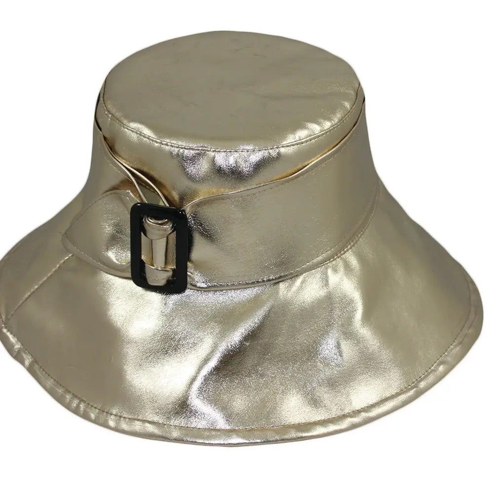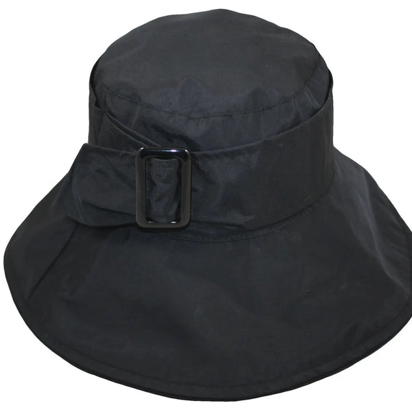 bucket hat- Polyester, water sealed, buckle & band accent around crown bucket hat.