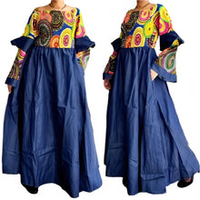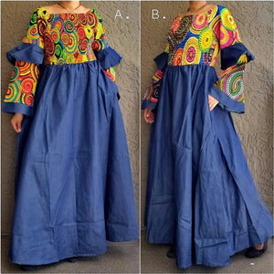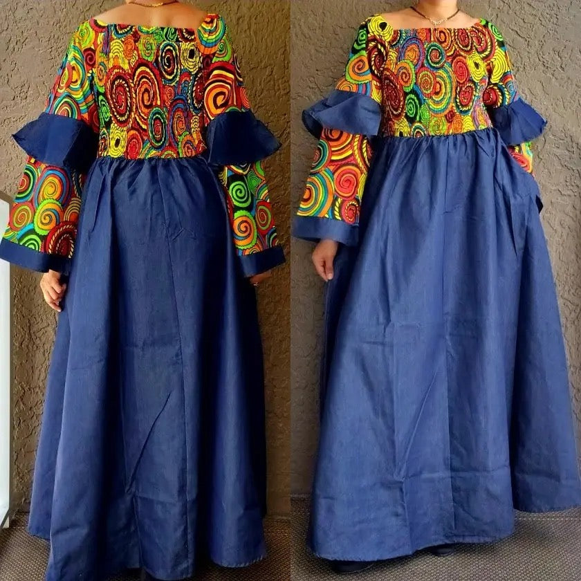Woman long denim dress with printed upper body. Can be worn off the shoulder or up. Smoked upper bodice. Has side pockets. Long length ( model is 5'7' tall) Free size fits L to 2XL