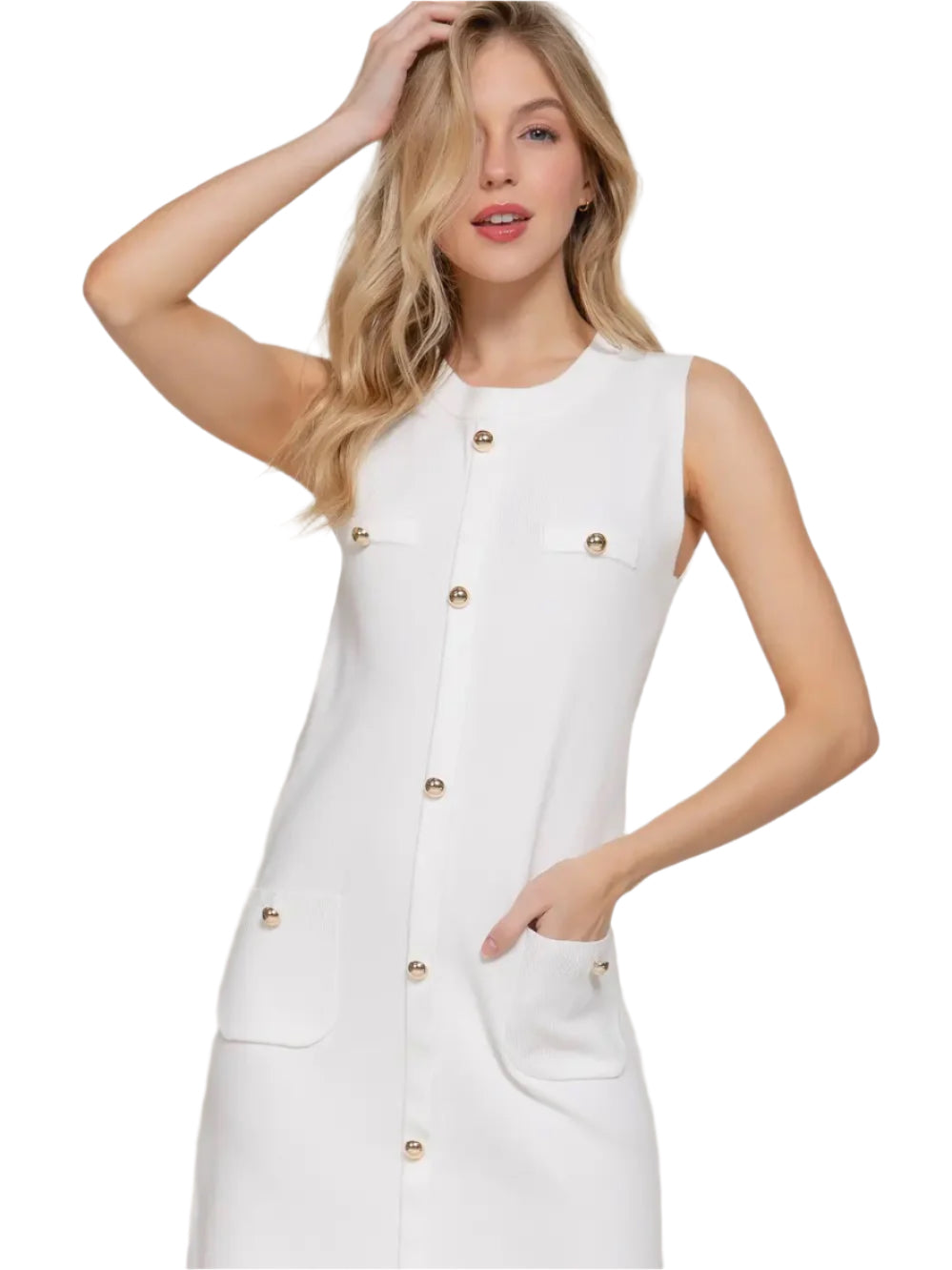 SLEEVELESS ROUND NECK BUTTON FRONT MINI DRESS