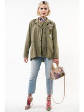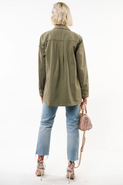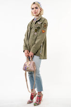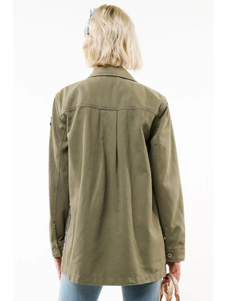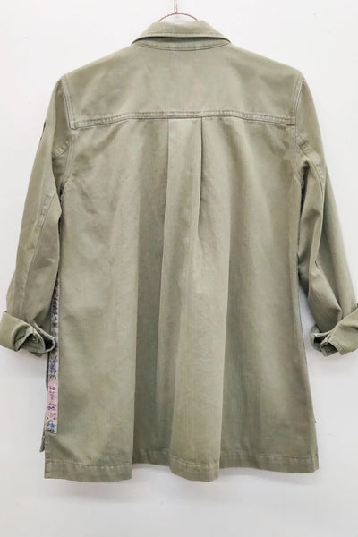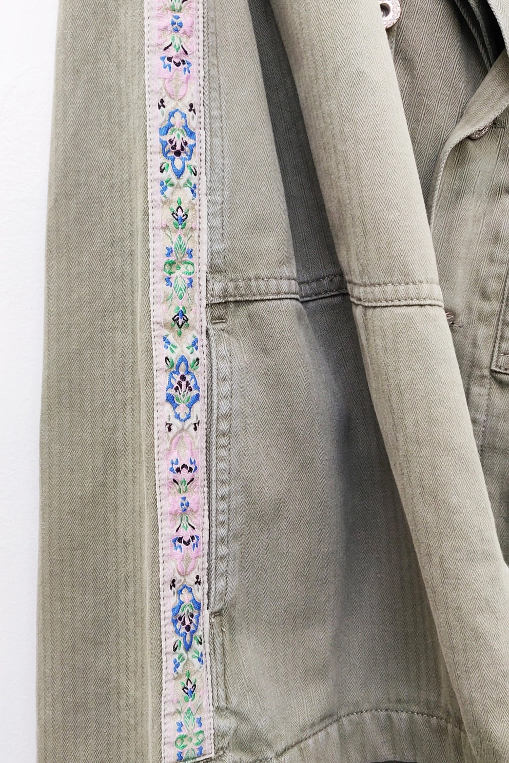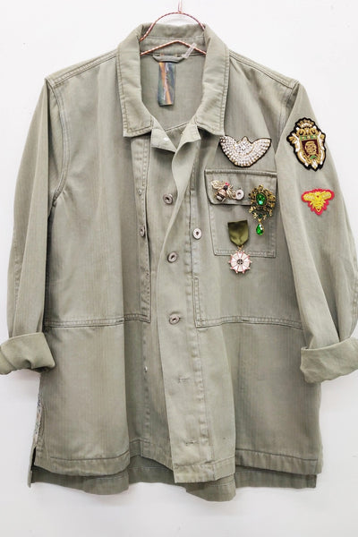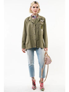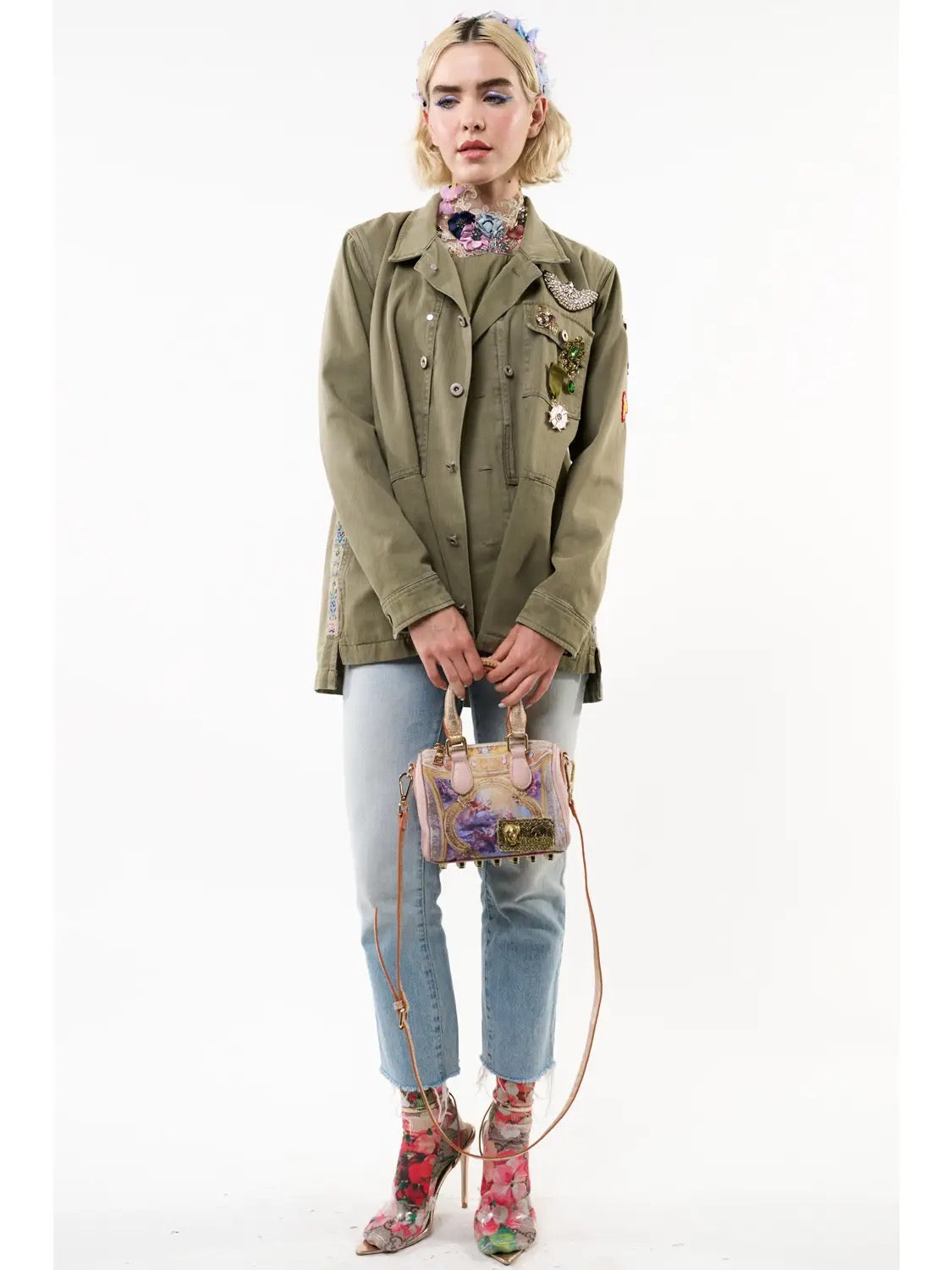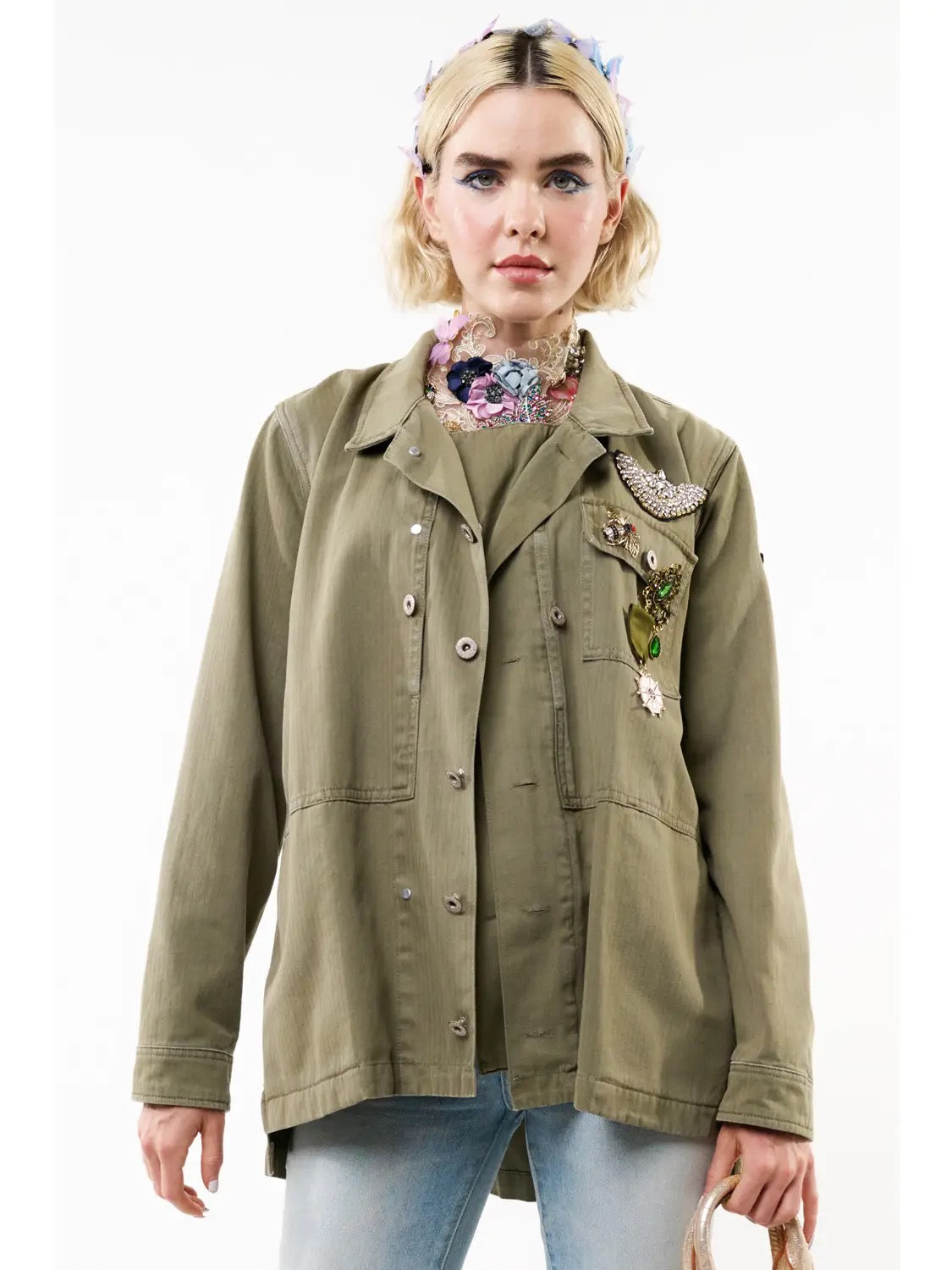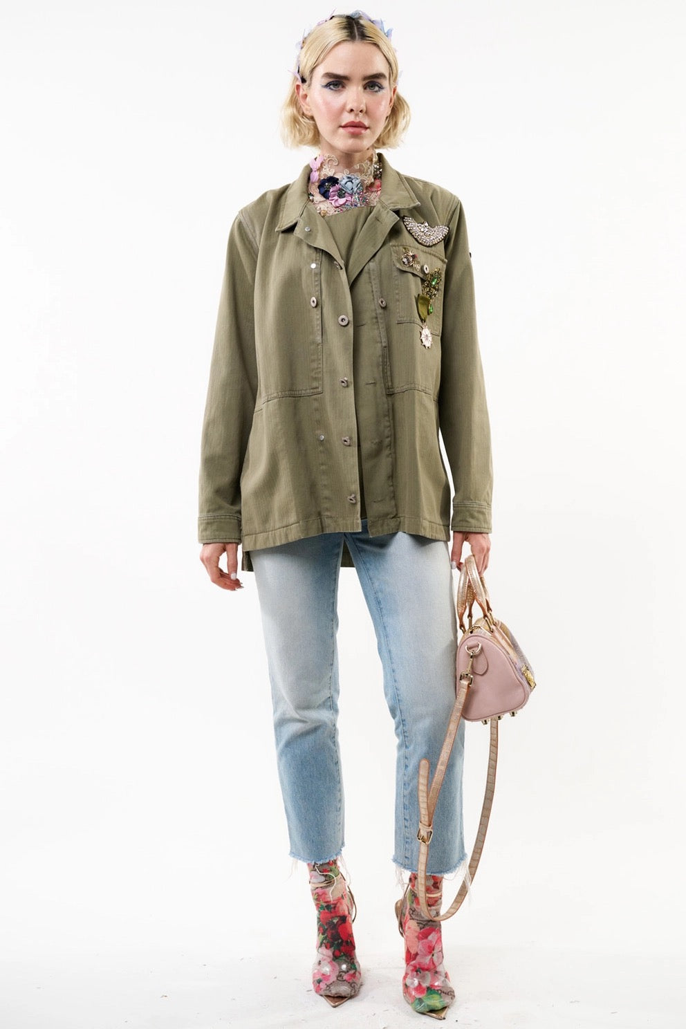 * Twill weave cotton army button-up jacket with royal/bee patches on left sleeve, pins on flap pocket & crystal patch on top of the pocket, high-low hem, slight slits on sides, sides with jacquard trims, CB box pleat, jacket not lined